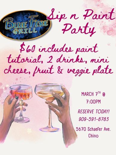Sip, paint, and unwind at Blue Fire Grill with LiaNardo Mobile Paint & Sip! Enjoy a guided paint tutorial, 2 drinks, and a mini cheese, fruit & veggie plate in a fun, creative setting.